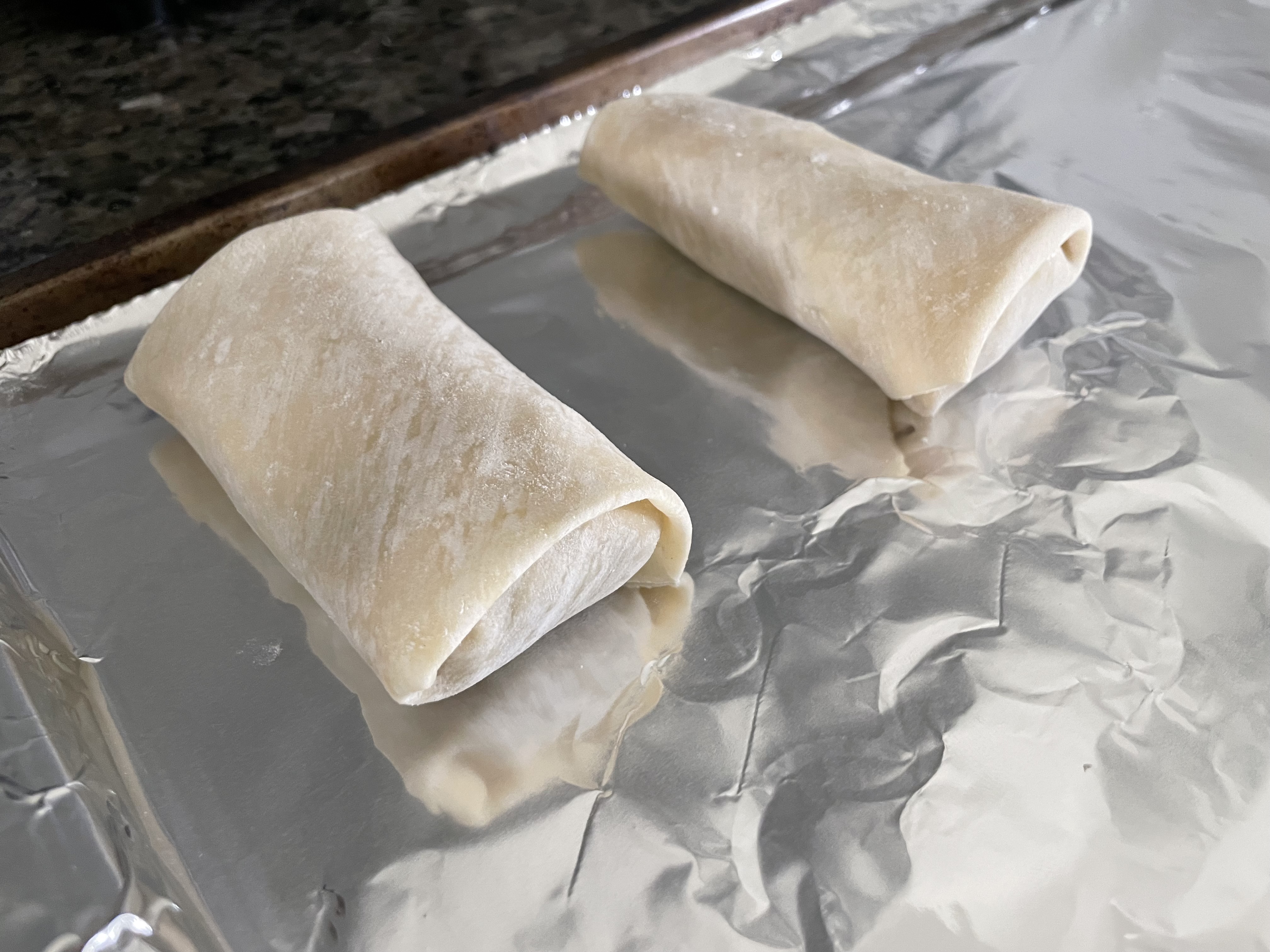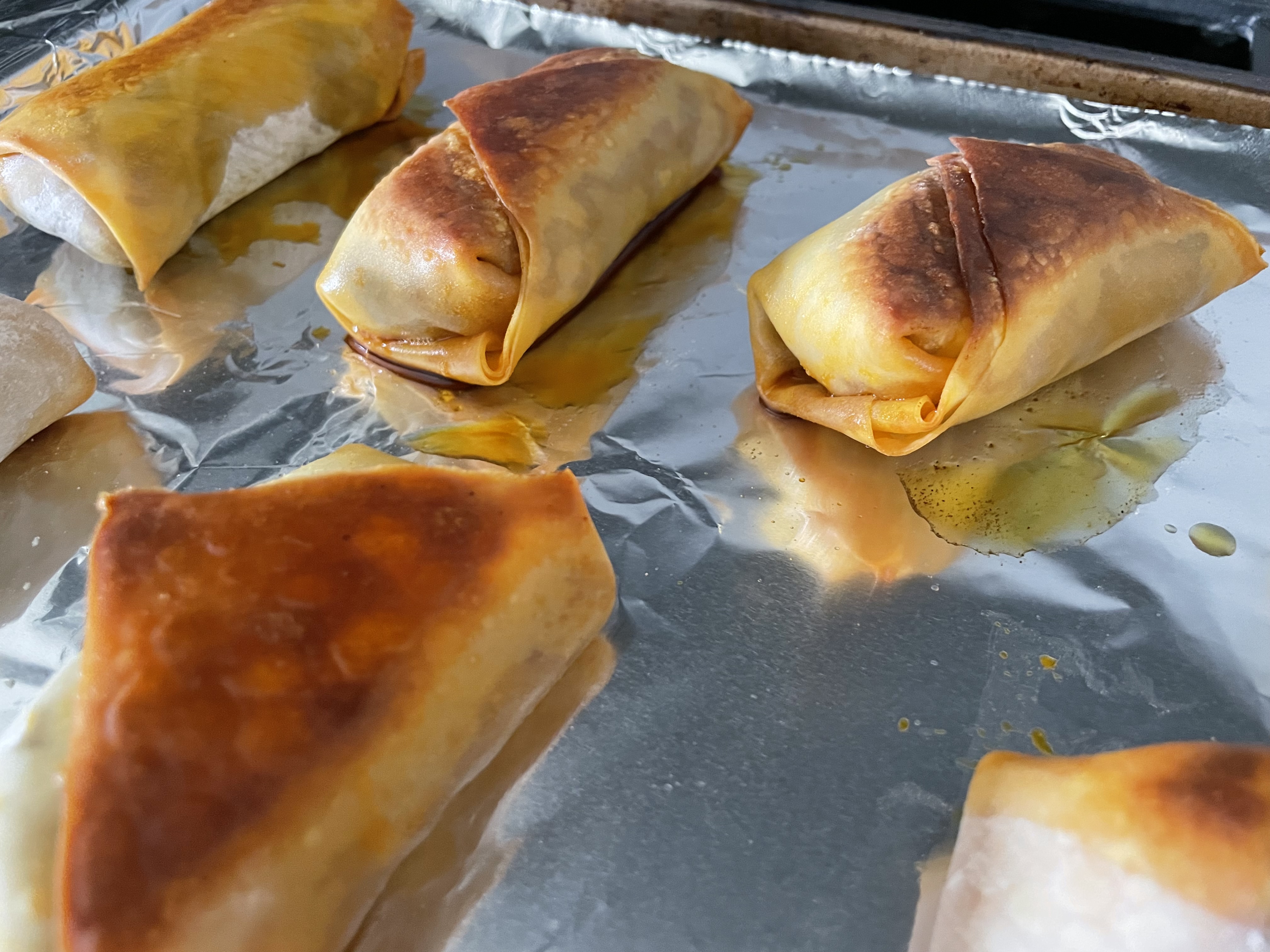 You’ll note above that I used two wrappers per egg roll. This was due to the disproportionate amount of chorizo to wrappers at my current disposal. Alas, another lesson learned for the next mole attempt! Anyways, the idea for the roll is pretty straightforward. You pull up the bottom corner aimed at you and fold it over to cover/tuck under the center point of your contents, creasing under and along as your fingers work their way to the edge. Next, you’ll fold over the left corner so that the corner rests atop the center of your contents now under the initial fold. You’ll crease along the left side upwards and repeat this process for the right side. Now the final roll! Roll up and along until the last most northern corner disappears beneath the fully rolled egg roll. Once all the chorizo egg rolls were rolled up for the amount of chorizo I had, I placed them on a baking pan and put them in the oven at 375 degrees for 12-15 minutes.