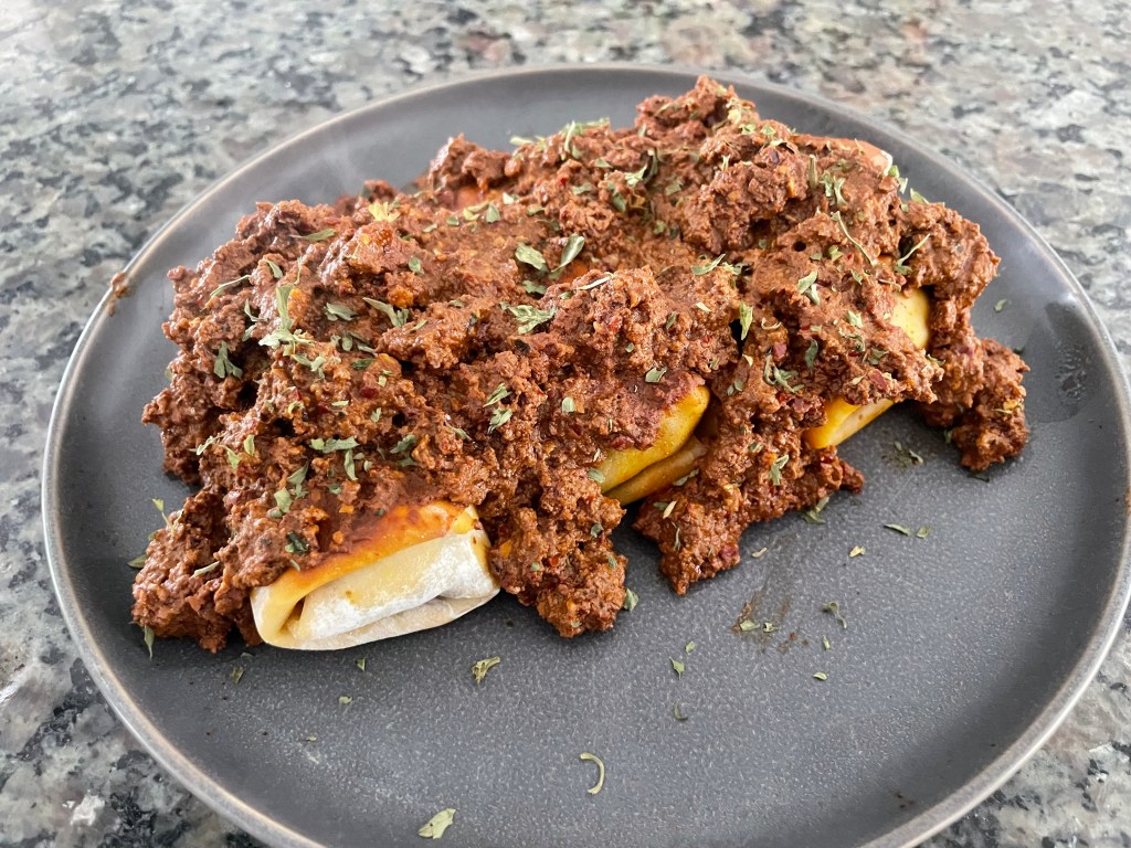 I put three egg rolls on a plate, then topped it with my mole sauce. Per usual, I threw a dash of parsley on top because I am just one of those folks. And here is the final result: