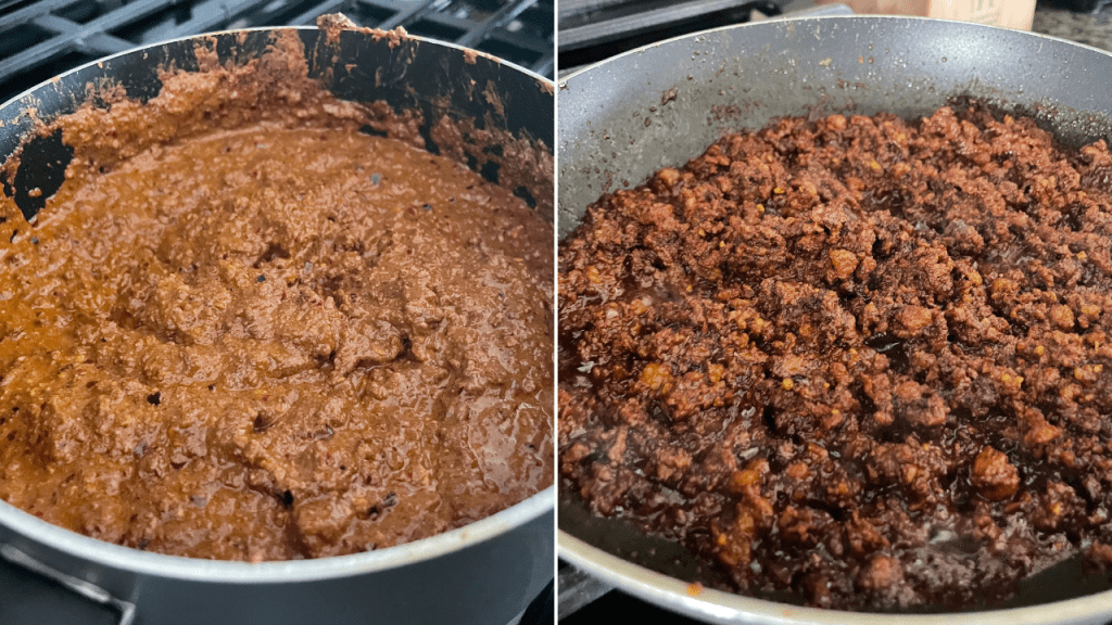 Next, I pitted and de-seeded the chilies, putting them and the pumpkin seeds in the blender. In hindsight, I’ll only use half the bag of California chilies for the next attempt and remind myself to grab two bags of ancho chilis! I then melted the chocolate with a thin slice of butter (and a dash of cinnamon) and added that mixture to the blender. I blended it all up and emptied the paste-like concoction into a pot on low heat. I eventually realized (thanks, Google) that I needed to add a stock liquid or water(?) to thin it out to its more usual sauce-based form. There was some chicken stock in the fridge, so I added what I could and began stirring, much to my joy, as I saw the paste quickly transition before my eyes to a regular sauce with gravy-like consistency. Reminder, this was my first attempt at making mole, so I’m not ashamed to admit it was definitely a learn-as-you-go experience, but sometimes that’s when I thrive at things like cooking, is on the fly.