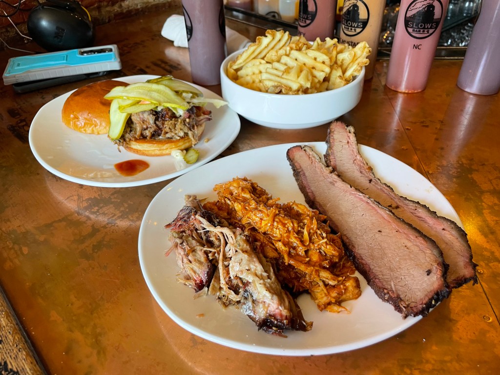 I walked into Slow’s BBQ and met up with my friend Rachel, who was sitting at the bar. It was a Slow’s first for us both, so we soaked up the environment and decisively ordered barbecue staples and Slow’s iconic sandwich that started it all: The Reason. I also ordered The Big Three, a plate featuring beef brisket, apple barbecue chicken, and pulled pork. And then, of course, we split a basket of waffle fries.