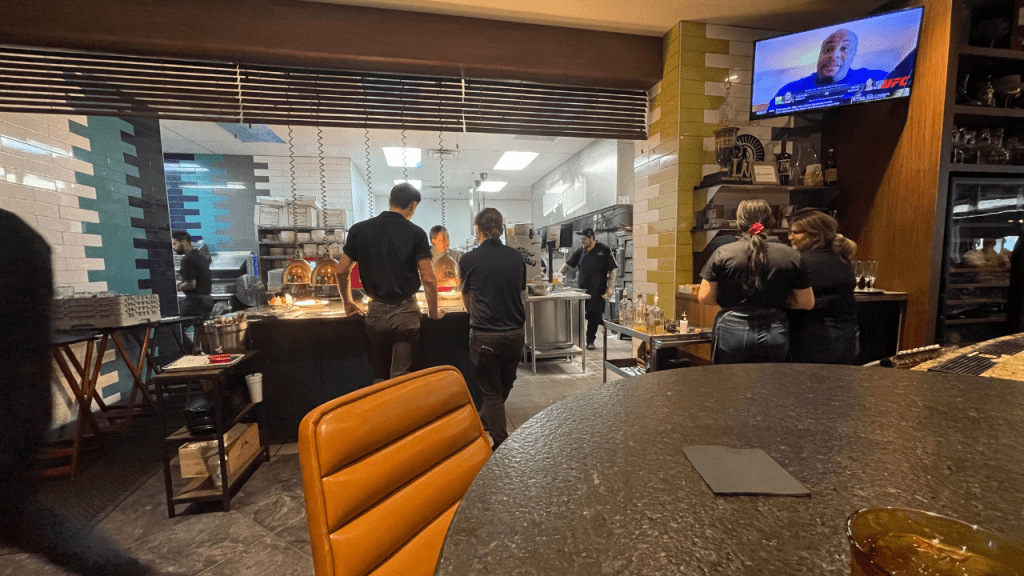 I’m always excited to meet a fellow Jeff (it’s a Jeff thing), and we chatted about how Mike crushed it in the International Pizza Challenge as he led Erika and me through the bustling restaurant to our spot near the bar and with a full range view of the kitchen. I’ve always been a fan of the open kitchen concept. I think it’s important for patrons to see the hard work (and sometimes immense stress) that goes into preparing the hundreds/thousands of meals throughout the night, along with whatever challenges arise along the way. It provides more understanding for the guests while keeping the staff tentative and on their A-game. The Chef’s Table was really cool, and I loved the design the Baldwins’ deployed for their kitchen and bar area.
