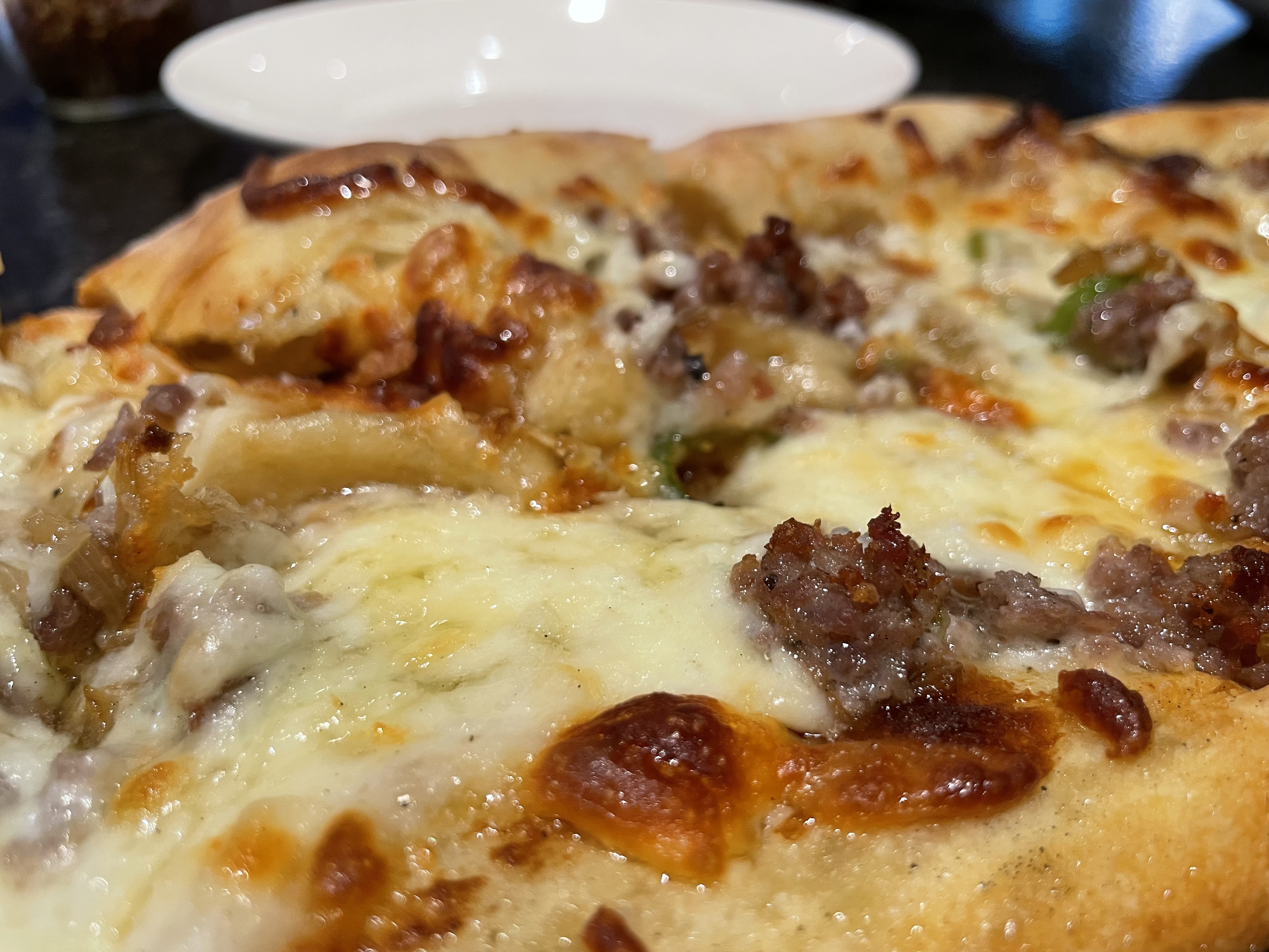 The Figa Biga caught Erika’s eye; it was a souped-up vegetarian with about as many toppings as the Roman-Style Mac Saturn & Cheese. This delectable pie featured Parmesan crust, mozzarella, smoked gouda, asiago, fresh pear, fig preserves, goat cheese, arugula, lemon juice, truffle oil, balsamic reduction, and sea salt. Every bite from this pizza had a little bit of everything going, with a nice sweet vinegary finish. The mozzarella and balsamic reduction paired well, as the reduction also did with the fresh pear slices. My only tangible negative takeaway was that the crust could have used more Parmesan and the pizza a bit more asiago. While I am a fan of arugula, the leafiness could have been softened or dampened a bit more, perhaps even simmered separately in a pan with the reduction before being added on after the pizza was taken out of the oven. Overall, it’s still a great pizza and a solid choice for anyone looking to avoid meat!
