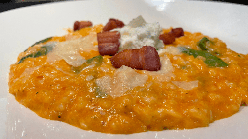 The seasonal risotto served was the Sun-Dried Tomato with sautéed spinach, herb ricotta, fresh pecorino Romano, and tender pork belly. I thoroughly enjoyed the tomato base and creamier consistency. Although the sauce dominated the rice slightly, it was packed with such great flavors and seasonings from the sauce and sautéed spinach; I didn’t mind not having the rice be more prominent than the portioning of sauce. The generous plop of herb ricotta added even more creaminess with earthy and garlic tones. This paired significantly well with the sharper and more tangy pecorino Romano cheese. The dish was creamy, cheesy, and downright delicious! And, of course, to top it all off, the savory and tender bits of pork belly really full send this into Flavortown, with all parts coming together in perfect foodie harmony. If I were to have it again, I think an optional heat upgrade would be cool, like diced cherry peppers or crushed red pepper flakes to garnish.