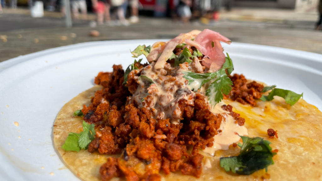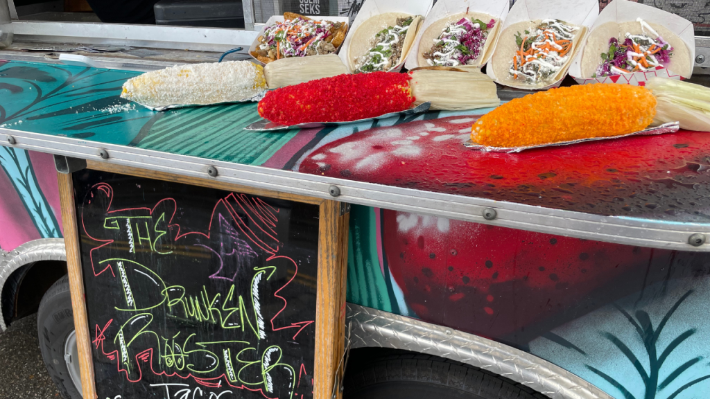 Even as I battled balancing my umbrella, gimbal, and phone (while trying to avoid getting my equipment or myself wet from the rain), I was already getting a rush of excitement after I walked in and entered “b-roll mode.” There was a live band giving a solid performance near the entrance, and it really set the vibe and bar high as the tunes welcomed me into the venue. The experience was reminiscent of the multiple times I’ve walked into music festivals, typically encountering your basic festival food/beverage tents within a few steps after going through security. This time around, however, you were also greeted at the entrance by the fused aromas of carnitas, chorizo, chicken, barbecue, and roasted corn right as you walked in!