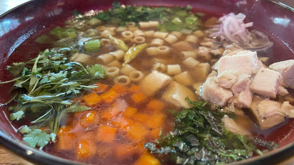 “When you see the words “Pho-Ken Noodle Soup” on the menu, you can’t pass up the opportunity to say that order to your server. And when you taste the dish, you will not be surprised to find out that it’s Pho-Ken good. It’s prepared as a combination of ingredients from a homemade chicken noodle soup and traditional pho. The bowl is an eye-catching sight of colors as your server pours the Vietnamese broth over the classically French-prepared ingredients. Altogether, each spoonful is an herbaceous bite but nothing unexpected. However, add in your own selected amount of hoisin, chili oil, and sriracha, and you’ll find yourself taking in spoonful after spoonful until all you have left is broth,” – Logan Tesmer.