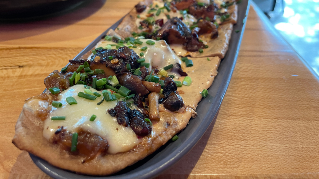 Next up, the Shimeji Flatbread! This flatbread was a sweet and savory experience, highlighted by the chili crisp shimeji, caramelized onions, and gruyere. The shimeji (also referred to as beech mushrooms) were saturated in chili and had a nice cook to them. The shimeji and shiitakes culminated into a nice earthy, almost meaty/buttery taste, which paired very well with the creamy gruyere and black garlic chèvre (goat cheese). The pièce de résistance, however, was the caramelized onions. Chef Cozadd implements a full 6-hour low heat tactic to fully develop and bring out the flavor of the onions. This is some serious next-level sweetness, and you could definitely notice it in every bite. You can’t go wrong with this selection; perfect for sharing (sorry, Logan!) or enjoy to yourself as an entrée.