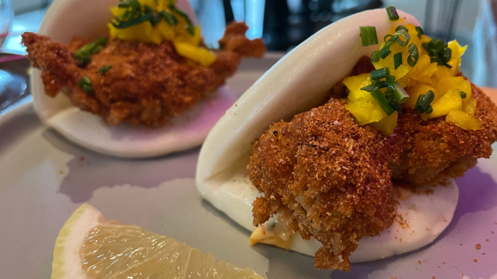 Logan and I placed a couple of orders, although due to Logan’s food allergies, he was tragically limited to two out of the four dishes. We ordered the Szechuan Hot Chicken Baos (a softer, sweeter variation of a Chinese dumpling, in this case, served like a taco), the Pho-Ken Noodle Soup (Logan proudly ordered this whilst pronouncing ‘Pho’ properly), the Koji Braised Short Rib, and Shimeji Flatbread. Several of the folks we spoke to, including the very kind people seated next to us, highly recommended the Shimeji Flatbread. Its visual appeal was off the charts, so I didn’t need much convincing. I was already keen on ordering some bao tacos, having tried them before at the popular eatery Clever Koi in Phoenix. I determined the sweet and spicy Szechuan Hot Chicken was calling my name. With our orders in, we buckled up for the rollercoaster ride to Flavortown!