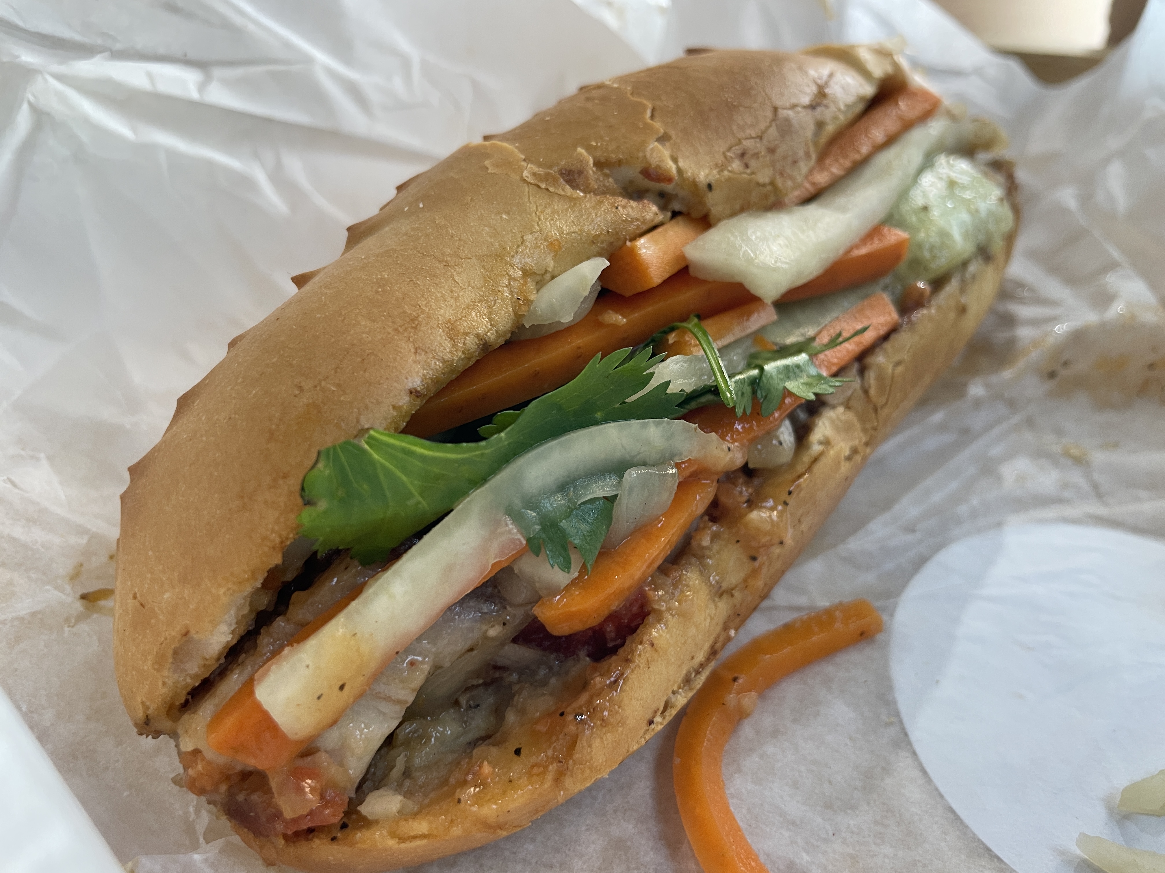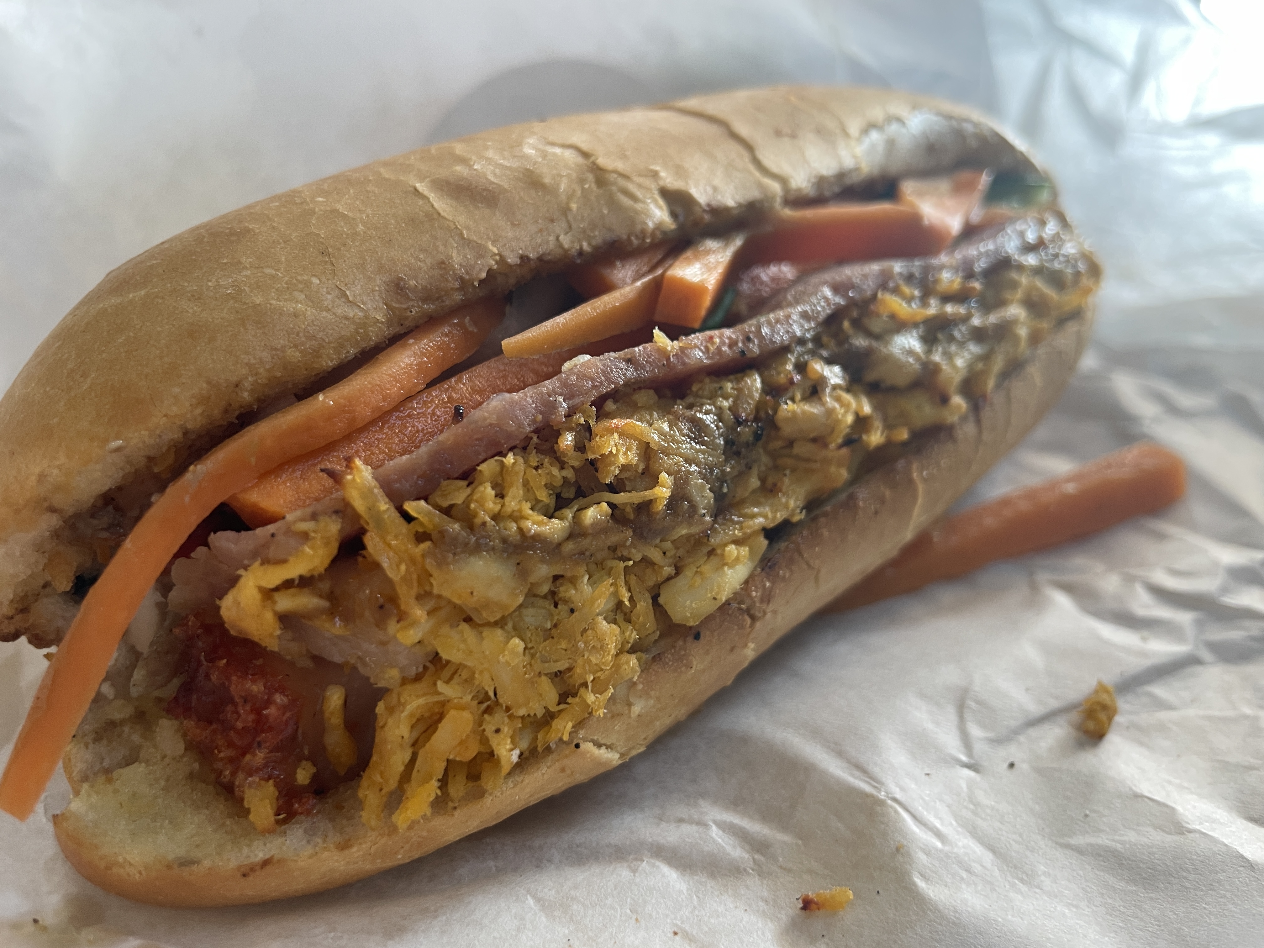 Taking a full bite of the 88 Special is where it’s at. A mouthful of the pork roll, shredded chicken, grilled pork sausage, Vietnamese ham, and roasted pork belly all in one bite is extremely satisfying. Again, despite only limiting myself to half of the sandwich, I really enjoyed this one. With all of the meats, it wouldn’t hurt to consider getting the vegetables on the side, but I went for it and had it fully loaded anyway. The meats are all delicious; notably, the shredded chicken and ham stood out upon first introduction to my taste buds, with each meat bringing its own life to the flavor party. The addition of the vegetables round out this banh mi as a hearty meal that will leave you full — I could only manage four bites! I would definitely get this banh mi again in its large form as the sole purpose of a visit alone, a very satisfying sandwich that will undoubtedly bring me back.