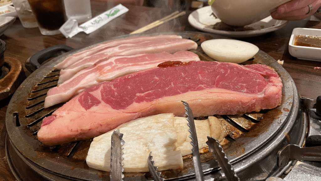 My crew and I continued to peck away at the beef the second the strips were pulled from the pan until none were left. We tackled the sirloin and pork belly next and used the cooking time for these thicker meats to catch our breath following an epic inhale of tasty Korean barbecue — and we were just getting started!