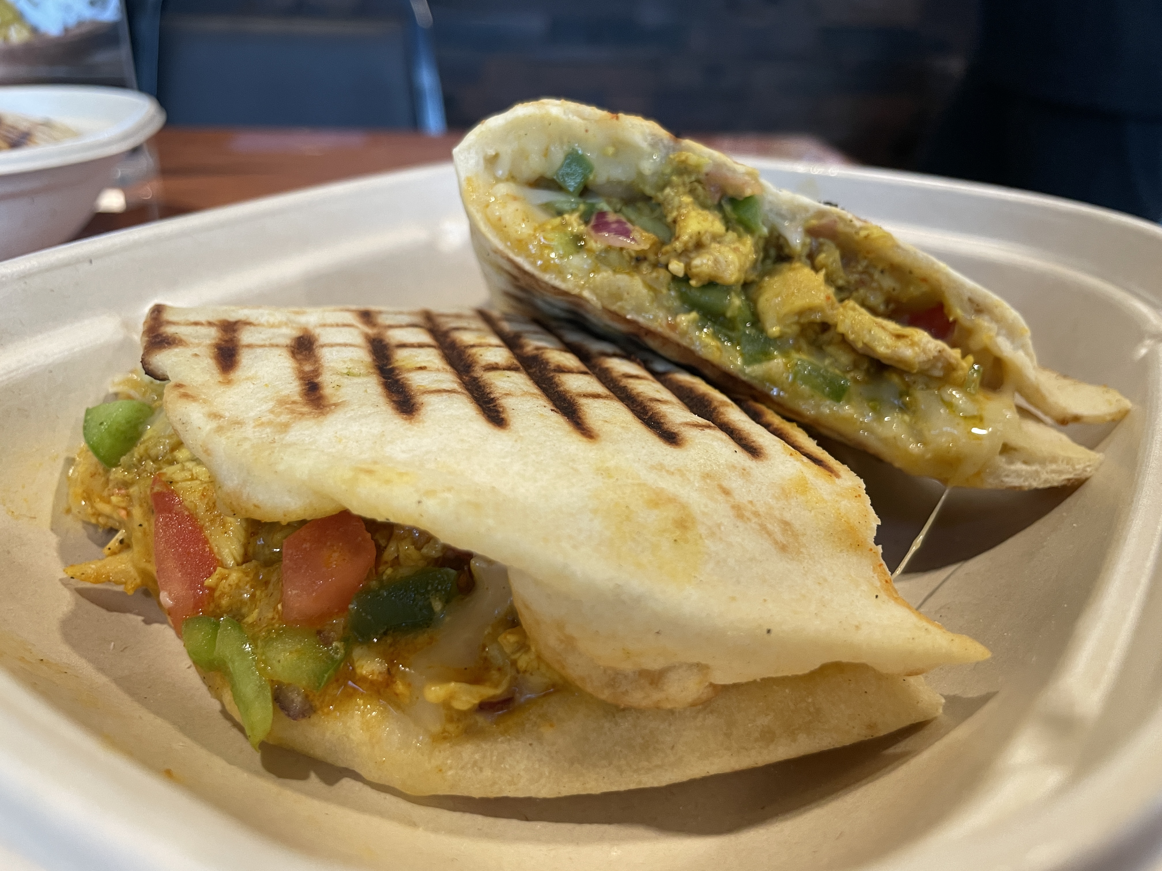 Chicken Tikka Panini: I took two back-to-back bites of decent-sized portions, really getting a full display of what was at taste. The freshly cut and diced veggies gave the dish a bright flavor and color, making the yellow chicken tikka more prominent and seemingly tender. All between a perfectly toasted but light and soft pita bread, with everything encased in the blend of cheeses on the next level of the interior. As seen more definably in the photo on the left, you’ll note the exceptional cheese clusters in the left corner of the panini and along the bottom and top. An A+ for the amount of and blend used to help round out this Italian-inspired sandwich as a must-try if you visit!