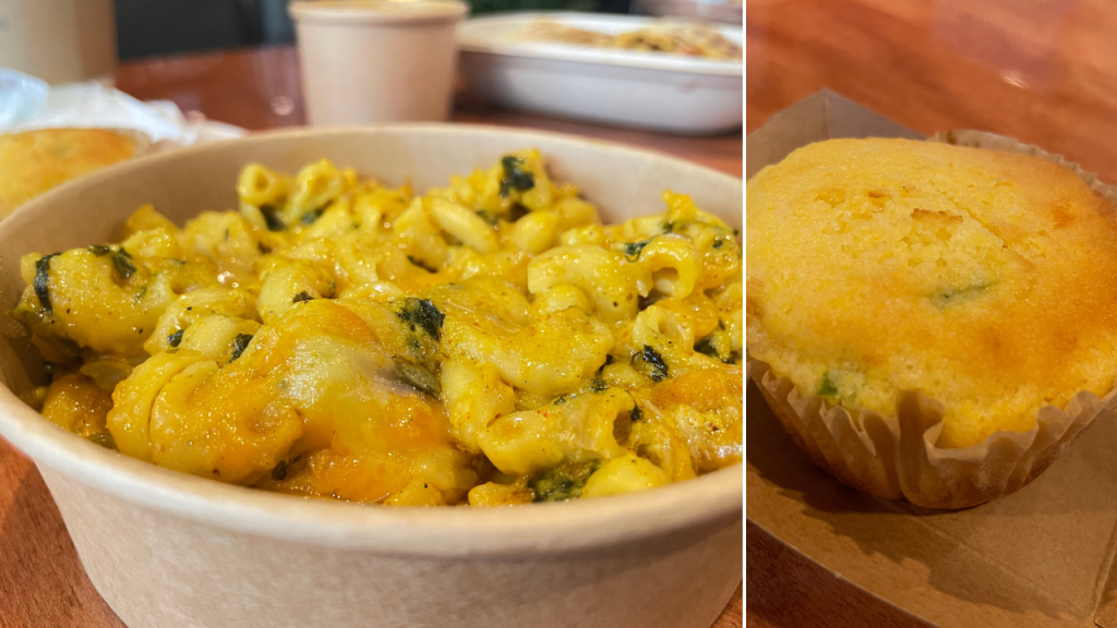 The flavors were cheesy, earthy, garlicky, and zesty. It was truly a masterpiece of flavor and deliverer of stomach satisfaction. The baby spinach was notable and flavorful, contributing wonderfully to the dish. The dish was also served with a hot corn muffin. The muffin was baked to perfection and held together very well, even after I took several bites. The ingredient balance is managed perfectly, delivering a sweet, doughy taste in a spicy and grainy soft corn bake. The pepper jack makes another guest appearance, lending additional spice and cheesy goodness for this incredible rendition of a classic side.
