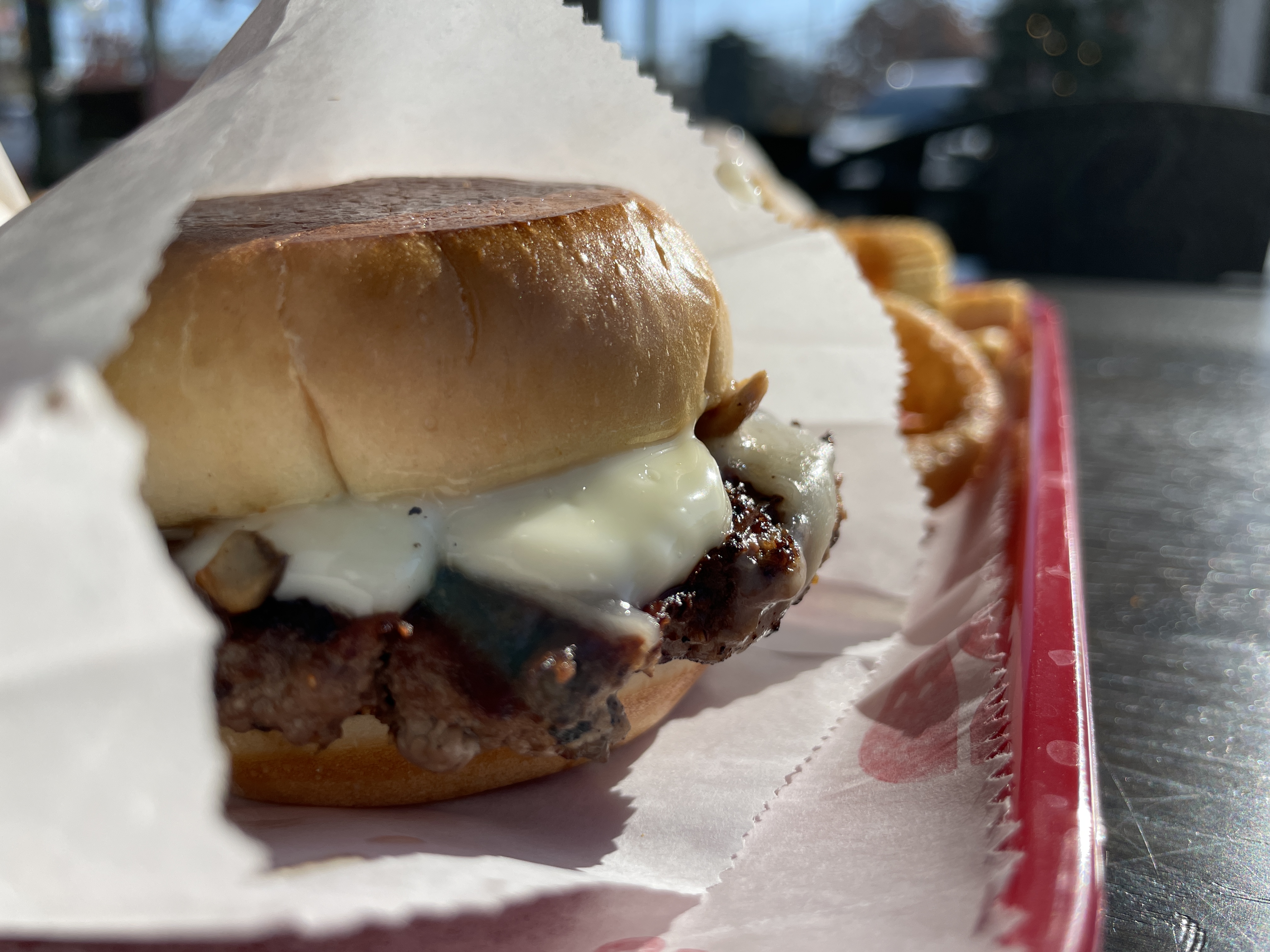 I walked around and took photos and videos while waiting for my order. Once my food was ready, I returned to my table, and my eyes widened at the sight of the tantalizingly packed sliders on the tray. Even though you really can’t go wrong with any of the 12 slider options at Savvy Sliders, I immediately felt like I had made the right choice for options to try this particular afternoon. The Mushroom Swiss had perfectly melted cheese, a noticeably thicker patty, and a lightly toasted bun. Meanwhile, the Boomin Chicken was bursting between buns with a thick cut of fried chicken and was absolutely smothered in boom sauce. I was ready to eat!