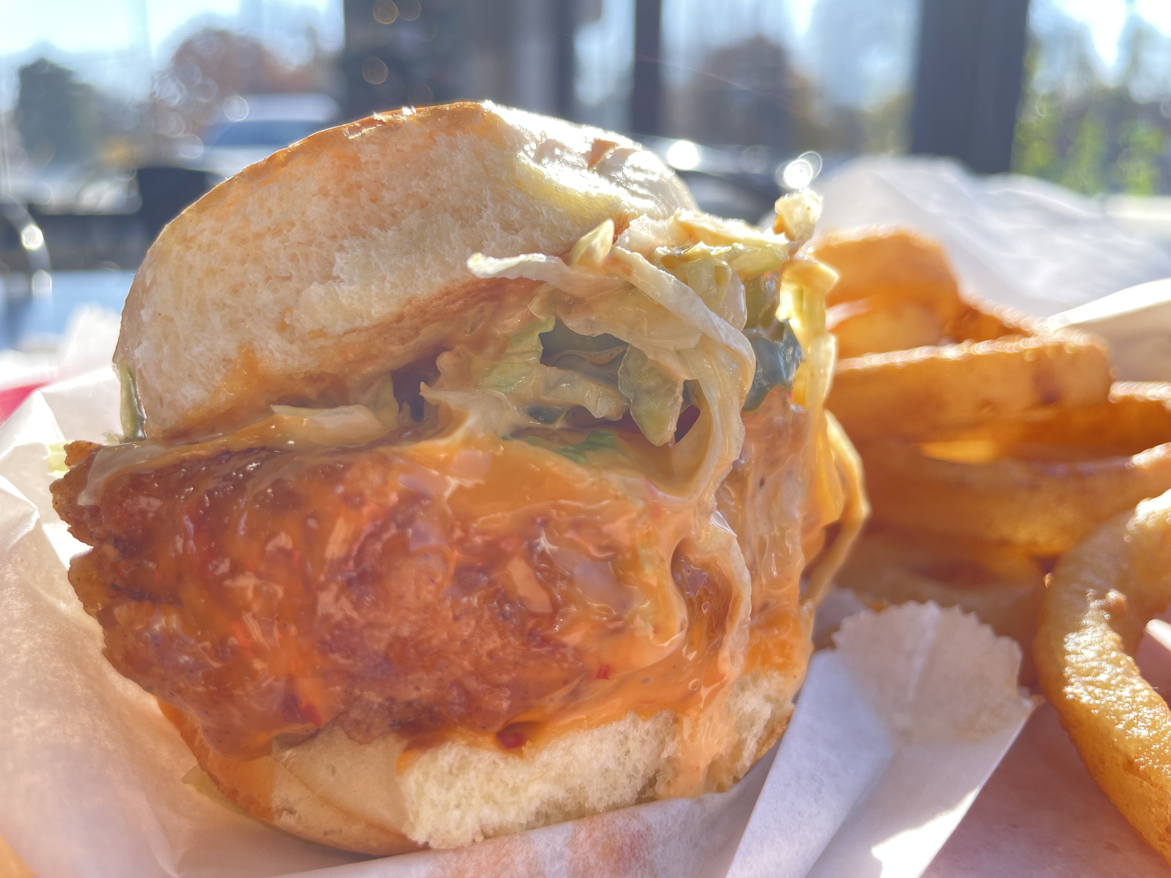 The Boomin’ Chicken was next up. I was impressed by the sheer size of the fried chicken used instead of the typical slider patty. The slider was overflowing with boom sauce, with the entire chicken drenched in the zesty and sticky sauce. The chicken was fried and cooked for a perfect length of time, tearing apart well with bites of copious pickles and shredded lettuce. The boom sauce is the show stealer, bringing some heat to the party. When wanting a change in slider scenery, the Boomin’ Chicken is a great option and probably my favorite out of all the selections I’ve tried. Another great aspect of these sliders is the light toasting of the bread on the tops and bottoms of the buns. I would later learn from Store Owner Jada Nannoshi that the buns get a grill press treatment, similar but for nowhere near as long as the patties.