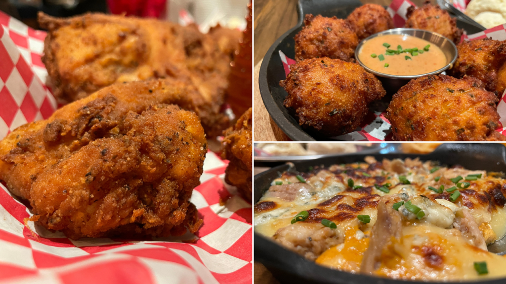 I felt like ordering a bit more than a usual outing in order to provide a more comprehensive scope review for options at The Eagle. Laurie and I went all out for the snacks and sides, ordering Hush Puppies and the Spicy Chicken Dip from the snacks list. We ordered the Mac & Cheese, Horseradish Mashed Potatoes, and Homemade Biscuits from the sides. We decided to split a Fried Chicken BLT, and for the main attraction, we went with the half-chicken. The half-chicken order consisted of two wings and two chicken breasts. And to top it all off, the fried chicken orders are served with spicy hot honey!