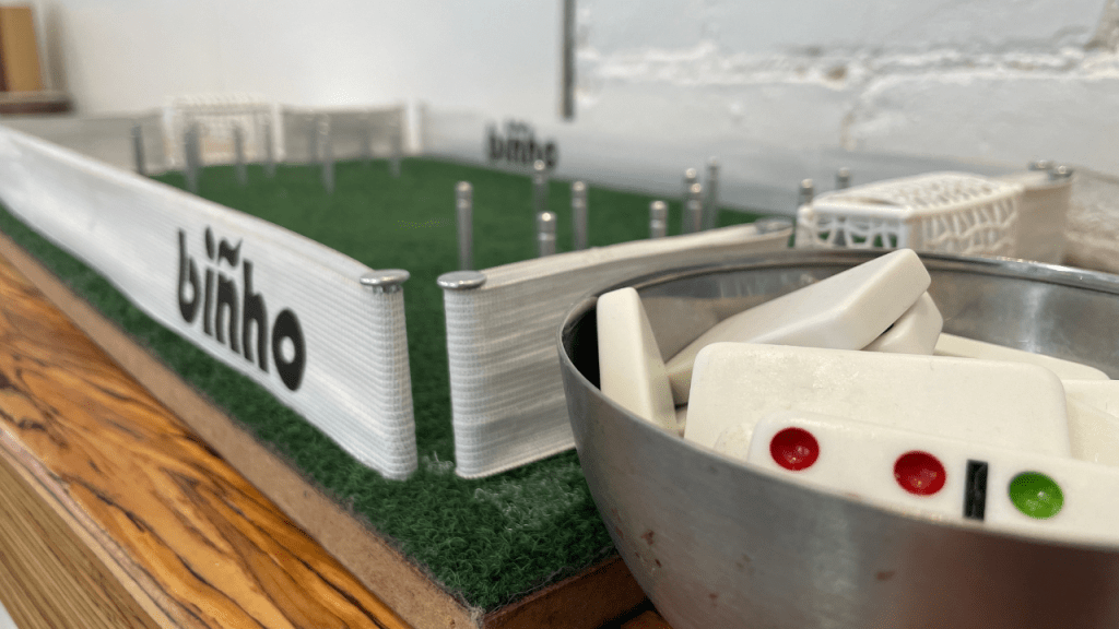 After quickly gathering (it had already gotten quite cold outside ahead of the impending snowstorm) my exterior video and photos, I walked inside. I was graciously greeted by Jessica, one of the managers I had been e-mailing with to coordinate my visit. Jessica gave me a tutorial on the menu and explained all of the cool facets within and about Frita Batidos. For example, I thought it was really cool that every table came designed with center sections offering water, cups, and sauce bottles. On top of that, every table had a bowl containing dominos, which could be used to play coincidingly with a type of table game that involved flicking a little soccer ball against an opponent. As Jessica led me to my table, I couldn’t help but also note the cleanliness of the establishment and how attentive and quickly the staff rushed to clean off and clear patrons’ tables post-meal. I sat down at a nice, lengthy table that looked like it could host quite a number of plates — I was ready to eat!