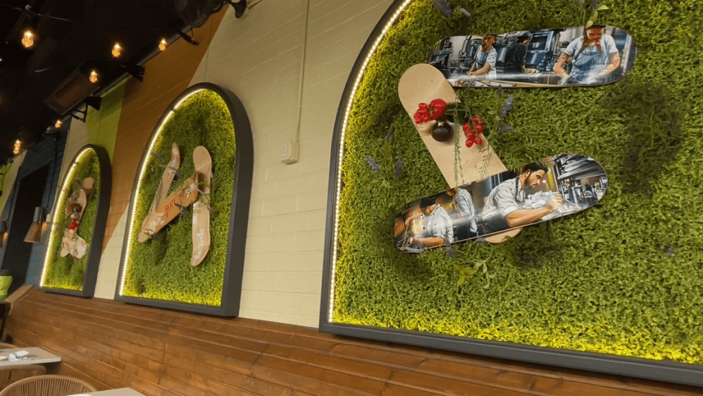 I arrived Wednesday afternoon, about an hour before the restaurant officially opened (and about 5 hours before my flight to Las Vegas for a bachelor party). One of the Testa Barra team members guided me to the recently enhanced patio for the interview. I shot some quick footage of establishing shots around the interview location, a large, prominent roundtable I immediately encountered after walking out of the patio doors. Gabriella rolled out a few minutes later as I admired artwork featured along the bottoms of skateboards that decorated the wall’s arched galleries along the patio. If you haven’t connected the dots yet, Gabriella and Mike are quite the skateboard enthusiasts. It makes sense; they’re pretty rad people!