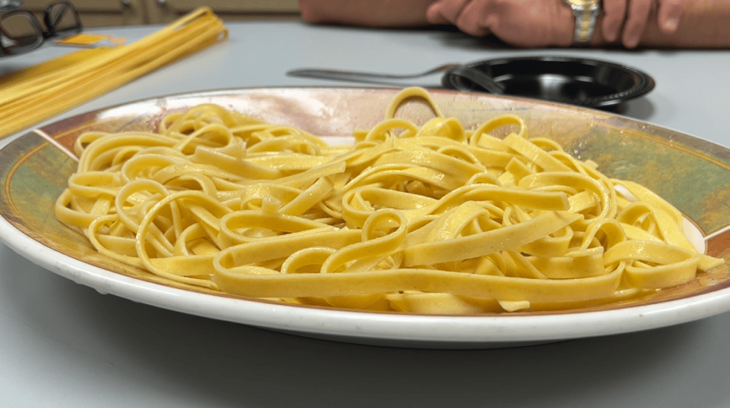 From where we exited the fresh production room, the tour returned us from where we had begun, successfully looping our way through production and storage at the facility. We made our way back to the small office as it was time for the formal interview with Vince. Meanwhile, Frank was whipping up various samples of Mucci pasta for me to try and for everyone to snack on for lunch. After seeing how the pasta was made, I was excited to try some of Mama Mucci’s pasta!