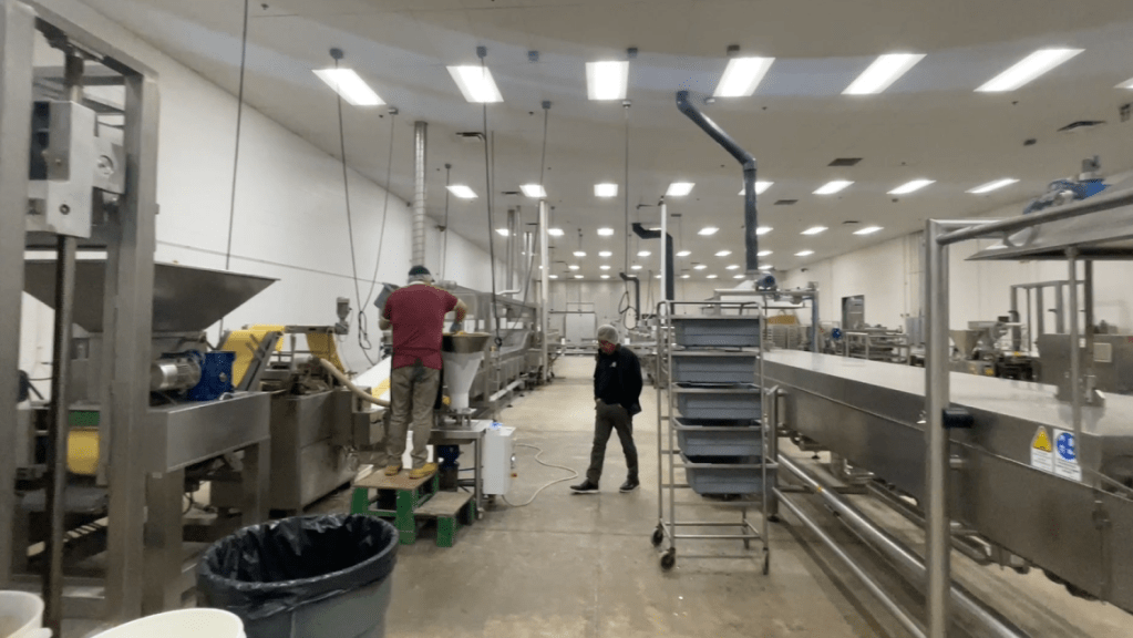 It’s hard to gauge from outside how large a 32,000+ square foot facility is until you step inside. We stood in this large open warehouse at the end of the facility that housed two long and intertwined production lines. Vince and I walked along the line on the left, which was churning out large stuffed ravioli. The ravioli moved along a conveyor belt to the next hurdle in the process, a long tank filled with boiling water to cook the pasta as it drifts its way through. After being dumped back out onto the conveyor belt fully cooked at the end of the tank, a worker stands vigilant nearby at the middle crossover section and separates any ravioli that may be stuck together before they enter the last tank of the journey: the freezing tank.