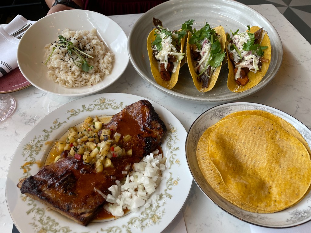 The Tacos Al Pastor comes served as a whole rack, braised in Al pastor marinade, and topped with grilled pineapple pico, onion, corn tortillas, alongside a bowl of rice garnished with cilantro. These ribs were slow-cooked very well. I had no trouble sliding my fork down the side of a rib, easily separating and guiding the tender meat into the fold of the tortilla, where I had already lined a bed of rice for the bottom layer. I spooned some onions and grilled pineapple and took a hearty bite. For the amount of meat and rice you get and the quality of ingredients, these tacos are worth every cent and then some!