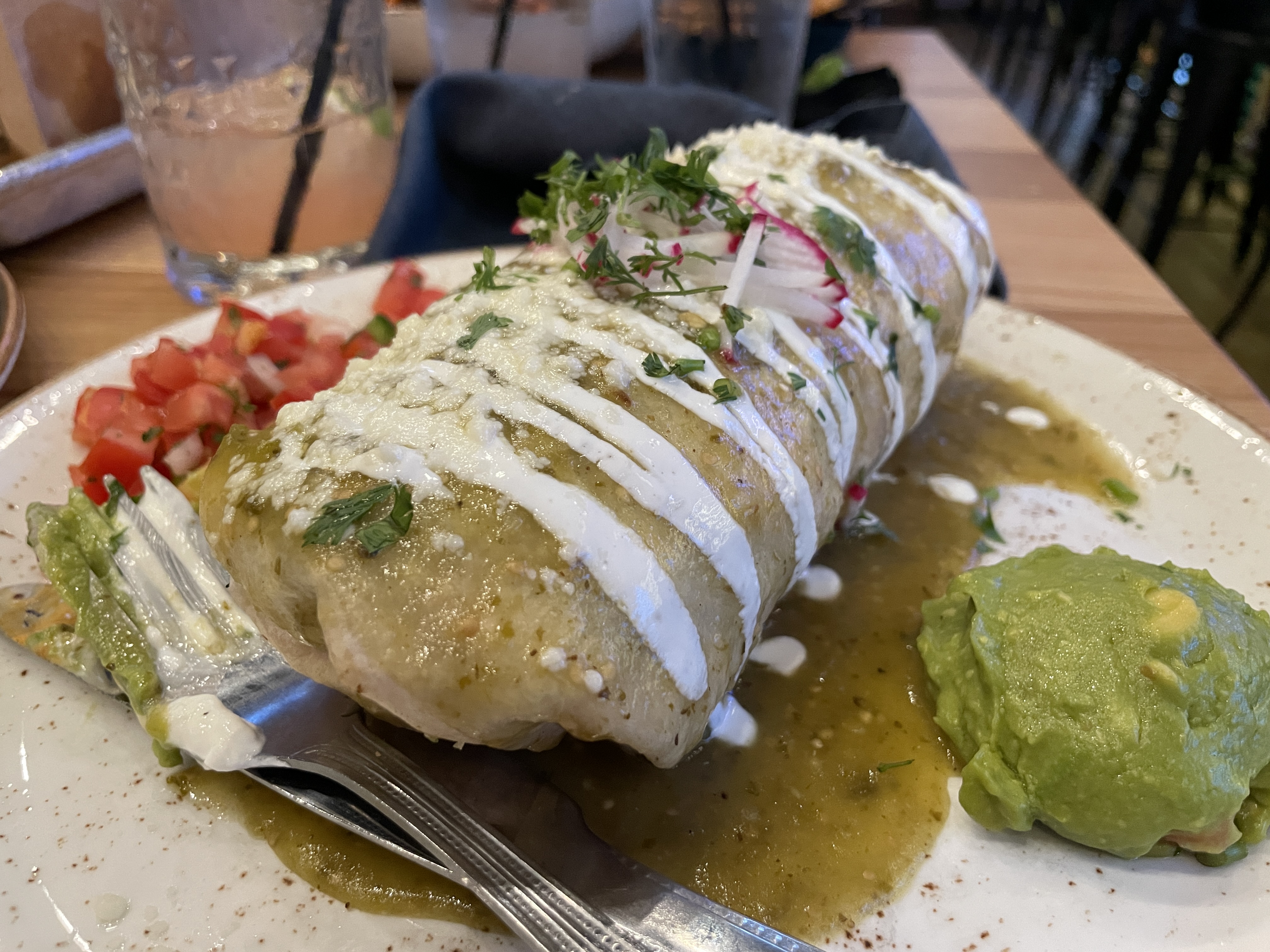 Our entrées arrived a few minutes after we had cleaned the plates of our appetizers, save for a few remaining smears of guac and sour cream. I ordered the Burrito De Casa for my main plate in the name of the gains. This hefty burrito is loaded with Mexican rice, black beans, Chihuahua cheese, guacamole, lettuce, pico, and finally topped with Verde sauce, crema, queso fresco, sliced radish, and ole reliable: cilantro. For my protein, I added shredded chicken tinga inside. Cutting away at this burrito was the most rewarding challenge, with each bite more succulent and filling than the last. The creamy fresco and crema were portioned perfectly across the burrito, ensuring every bite had a creamy and cheesy finish. The spices from the chicken tinga were notable and delicious, with generous portions of juicy chicken appearing in every bite.
