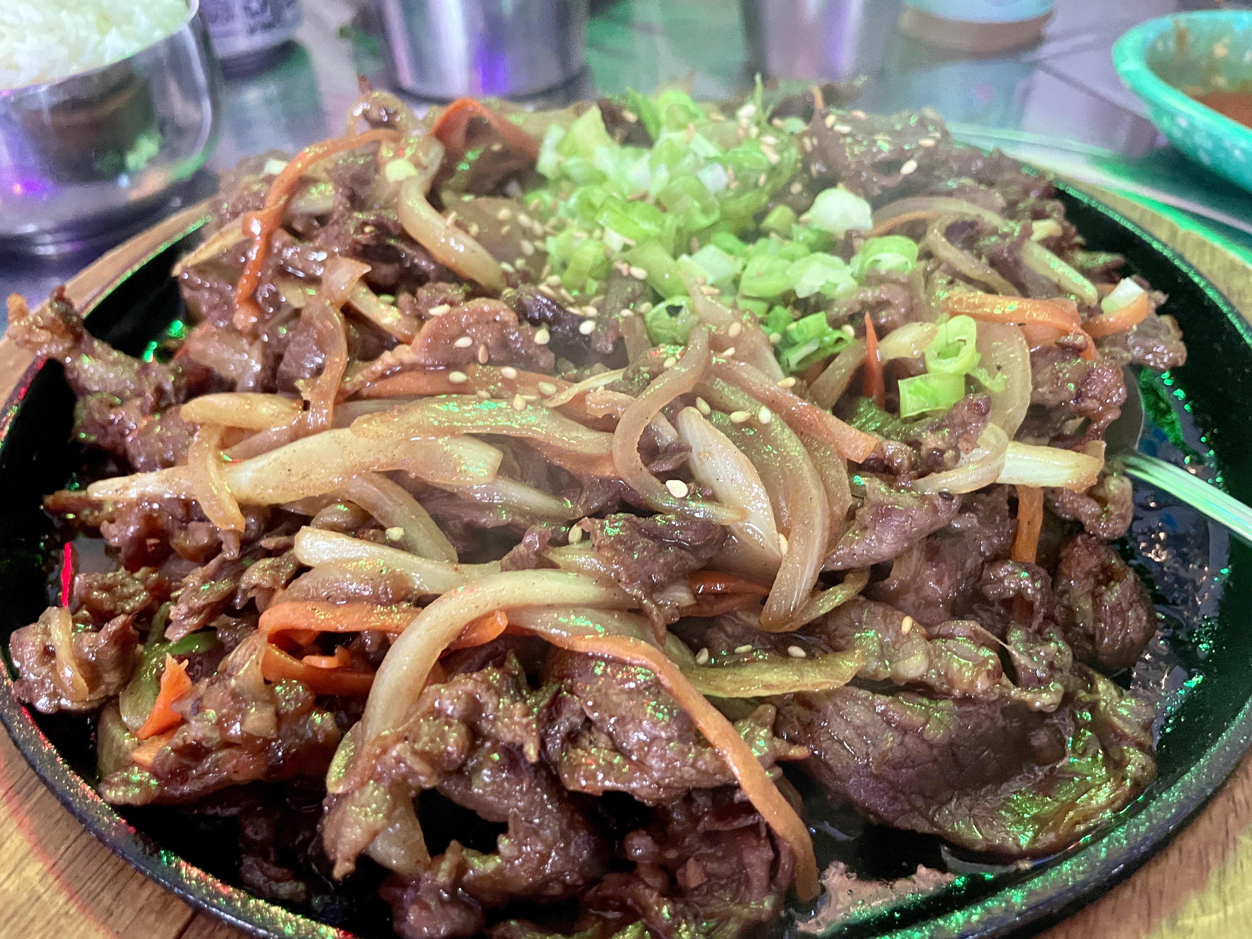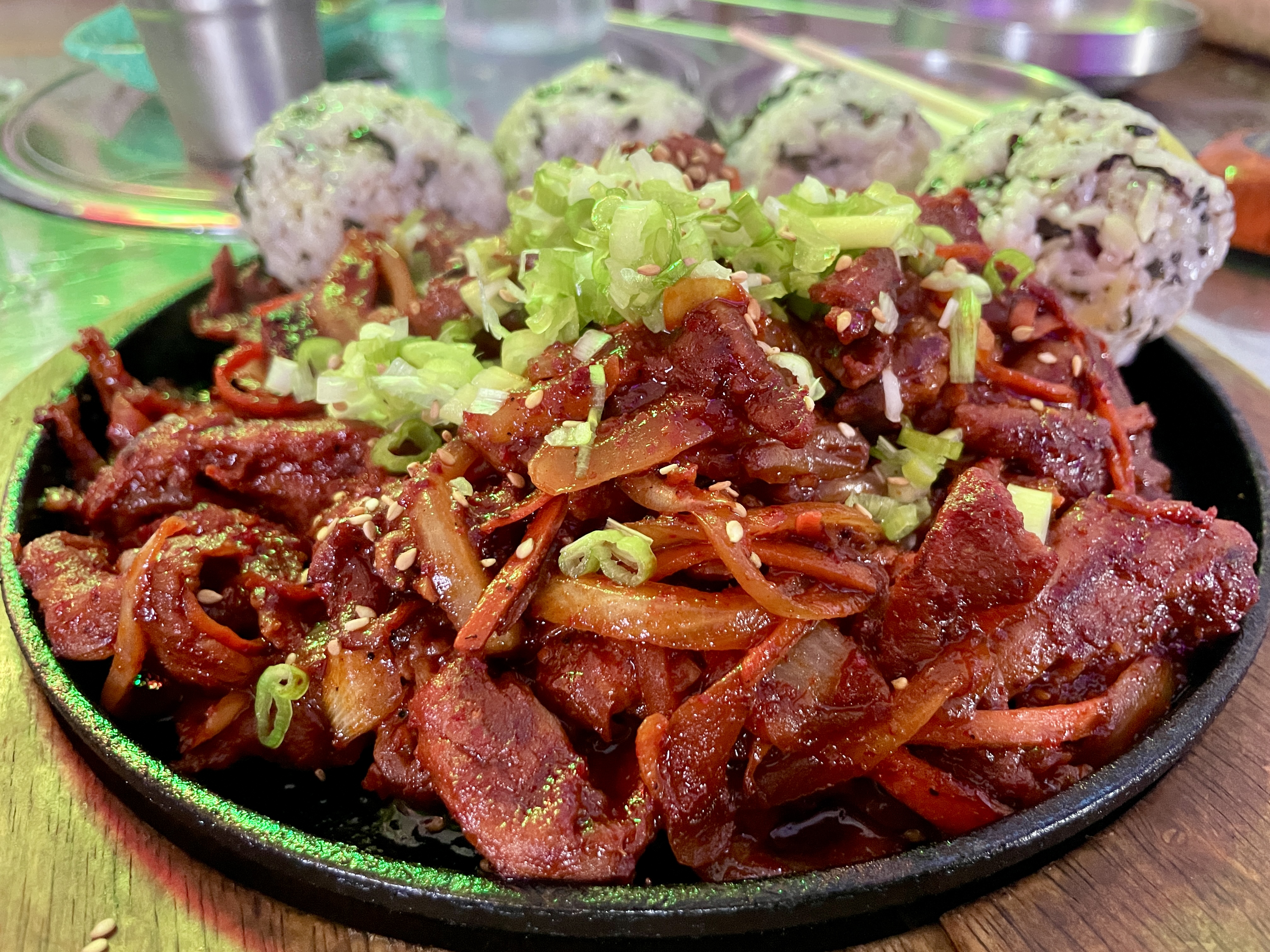 I enjoyed chopsticking bites of pork with the white rice served on the side. As you’ll notice on the plate above with Spicy Pork, we added the Jumeok-Bap (rice balls) to our order. Jumeok-Bap is a rolled-up rice ball, sometimes with other things rolled in like seaweed flakes or sesame seeds, and is often served alongside spicier dishes. This rice was superior to the white rice, which held its own and was solid in its own right, but the Jumeok-Bap came loaded with so many additional flavors that I realized I ate my rice ball way too fast!