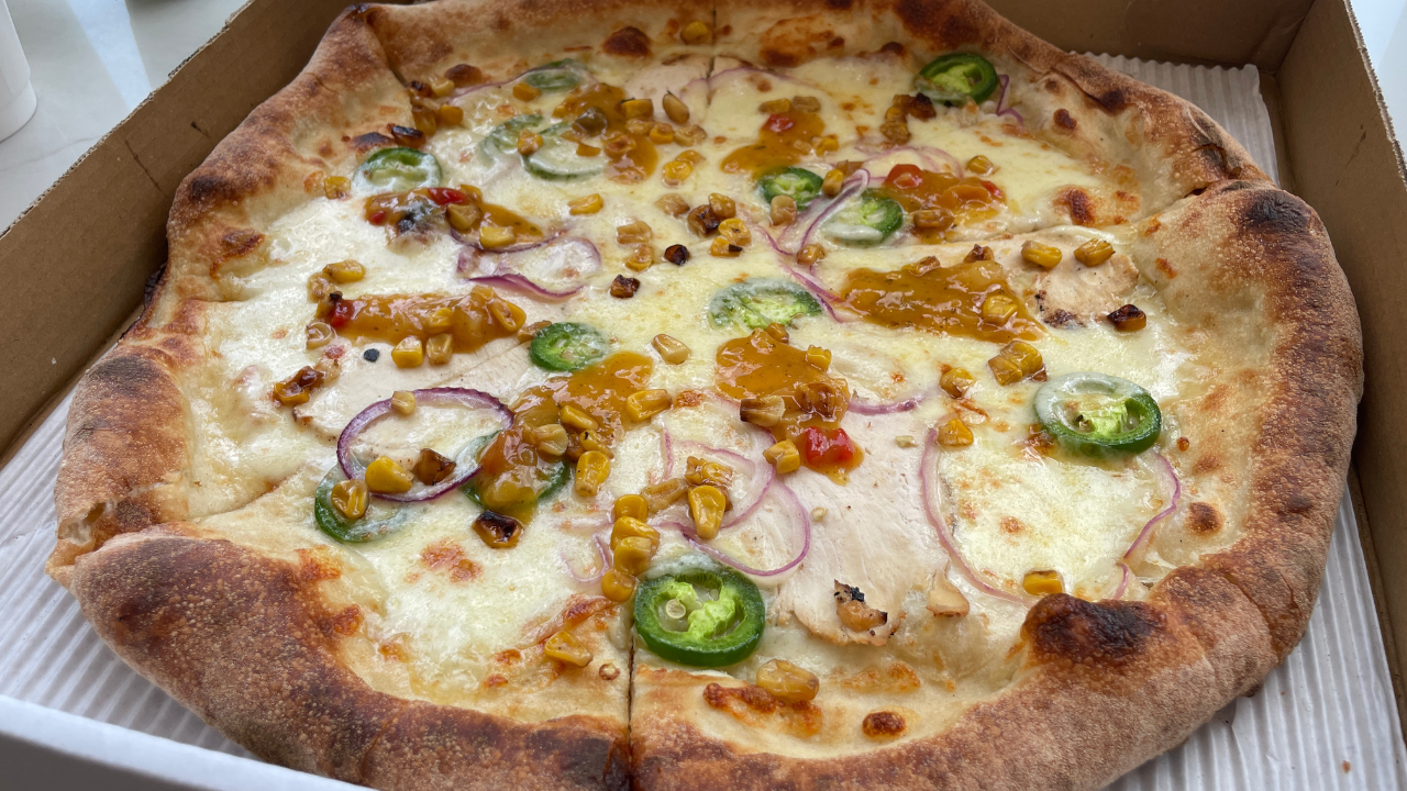 The good pizza vibes carried on to the third and final pizza, the Chicken Mango Habanero (Amanda’s favorite pizza). The pizza is topped with mozzarella and fontina cheese, some kickin chicken sourced from Chestnut Farms, freshly sliced jalapeño, red onion, roasted corn, and zesty mango habanero salsa.