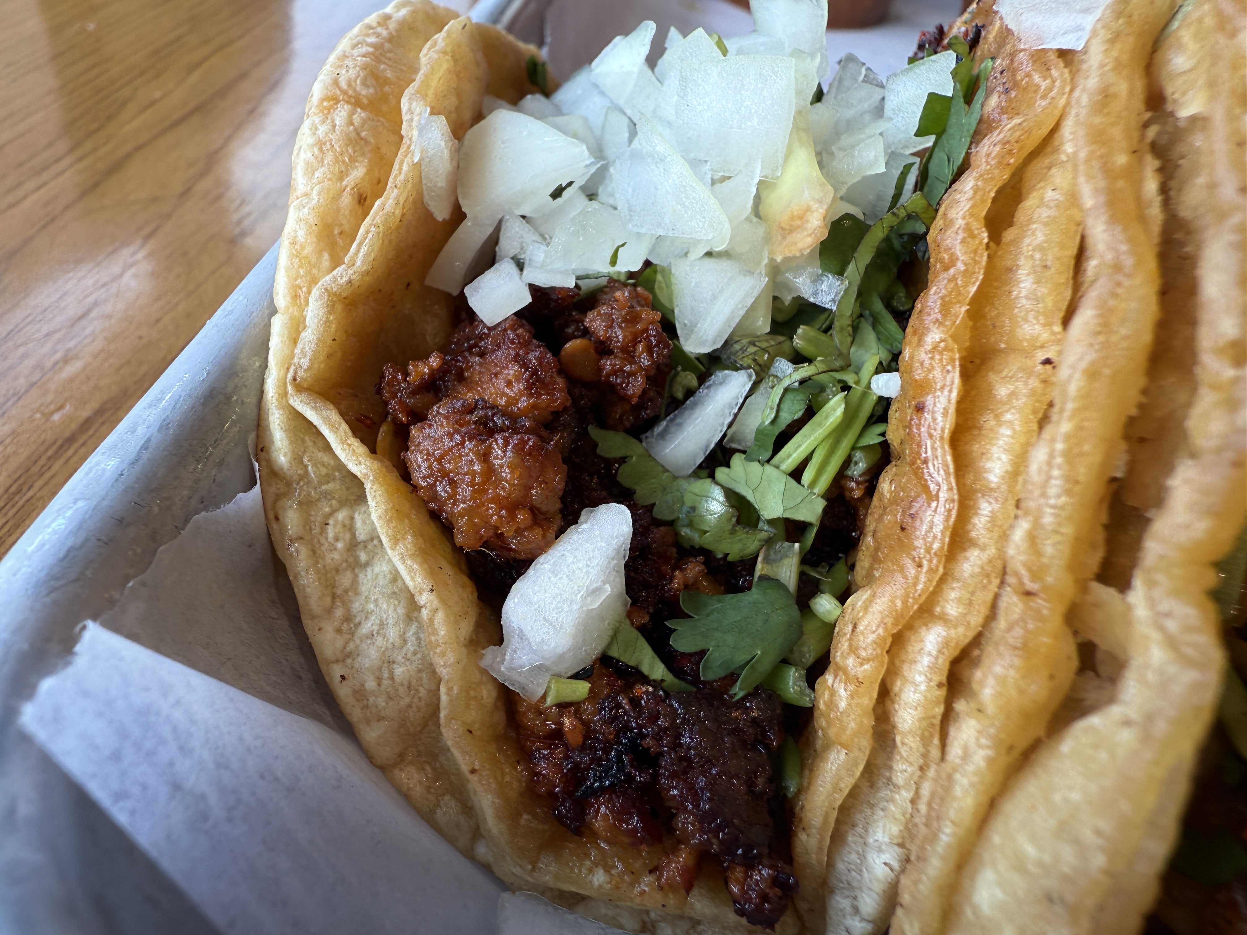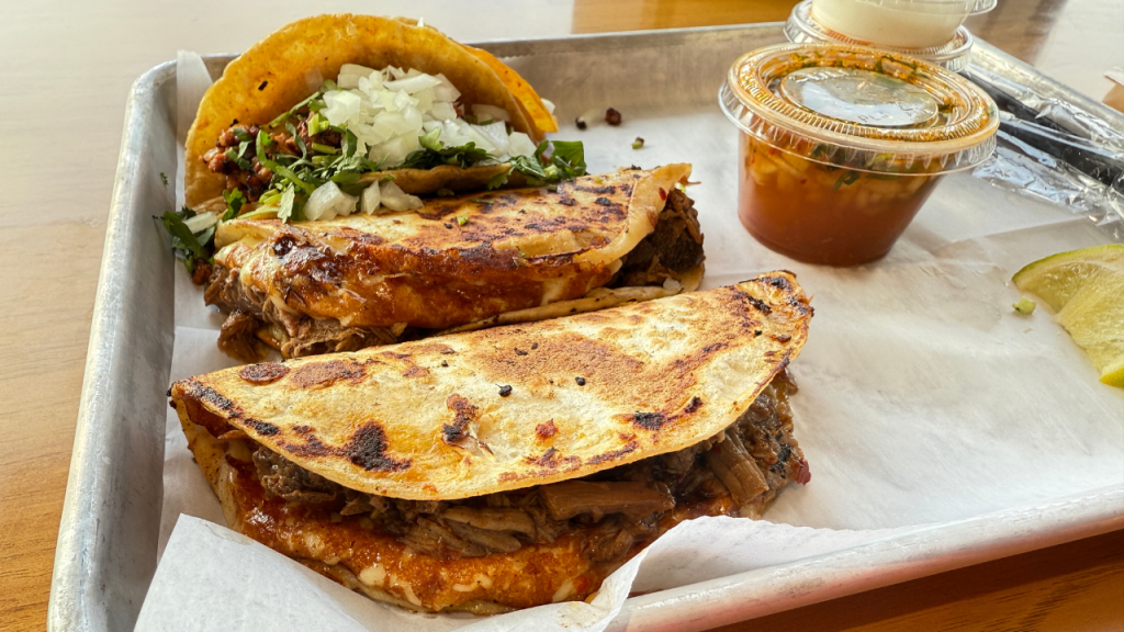 I had a few moments to dissect the menu and decide which tacos I wanted to experience for my first visit. Whenever I check out a new taco establishment, I usually go with my favorite: chorizo, then usually Al pastor or birria, but in this case, I went with the whole trifecta! I noticed the small whiteboard beside the registers listed the specials and most popular items with patrons. So I ordered chorizo and Al pastor tacos on corn tortillas and tacked on two birria quesadillas on flour tortillas, one of the most popular menu items! I love birria and quesadillas, so I won’t miss the opportunity to try such a glorious combination of food items.