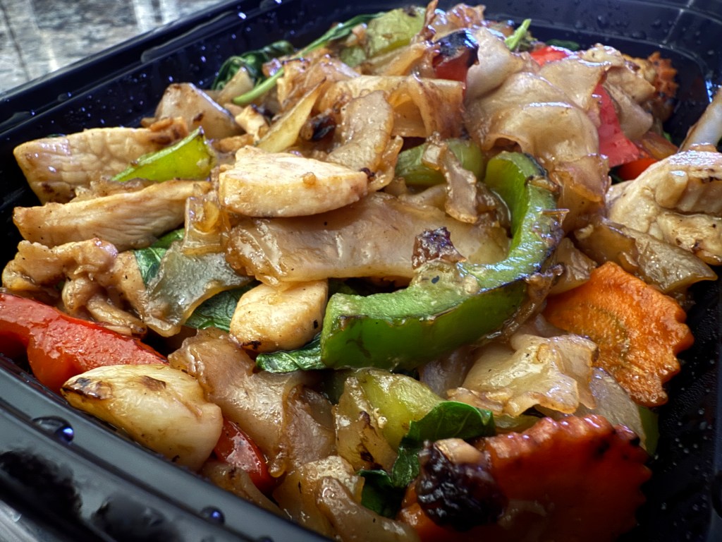 My order arrived about 20 minutes later. I eagerly ripped open the delivery bag to gain access to the food containers within. As I write this amid a now fully developed head cold, I will say that I’m honored that one of the last true things I could smell (before waking up totes sick the following morning) was my drunken noodles order from Saab Sis Thai. The noodles were wide rice noodles with a spicy Thai garlic sauce whose aroma emanated heavenly from within the sealed container. I ripped off the lid, freeing an eruption of steam that had built up from within the confines of the stir-fried dish.