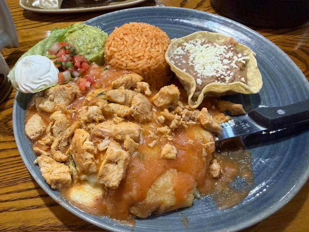 It had been a few years since I last enjoyed Chile Rellenos, so in the absence of my beloved Cochinita Pibil, it felt like a great option to re-familiarize myself with. Maria’s rendition of the dish, whose origins come from Puebla in Mexico, features a poblano pepper stuffed with cheese, smothered in ranchero sauce, and served with lettuce, Pico de Gallo, guacamole, sour cream, rice, beans, tortillas, and a choice of either ground beef or chicken. For this particular foodie adventure, I went with the chicken.
