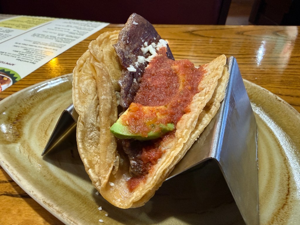 When it came time to order, I went with the Choriqueso appetizer, a Prime Rib taco on a corn tortilla, and the Chile Rellenos for my entrée. I was more than prepared to take leftovers home, even though I made sure to eat light earlier in the day. As I waited for my food, Maria stopped by my table and we caught up as I snacked on some chips and salsa. I was thrilled to hear that, after being open for five months, Maria said she felt like the restaurant was finding its groove, continuing to listen and curate the menu to accommodate the area’s expectations, while also slowly introducing more traditional Mexican dishes patrons might not be as familiar with. For example, I was initially looking forward to enjoying Maria’s rendition of Cochinita Pibil, but it hasn’t been introduced to the menu yet. Thankfully, after I jokingly inquired about it, Maria assured me that it will be added soon!