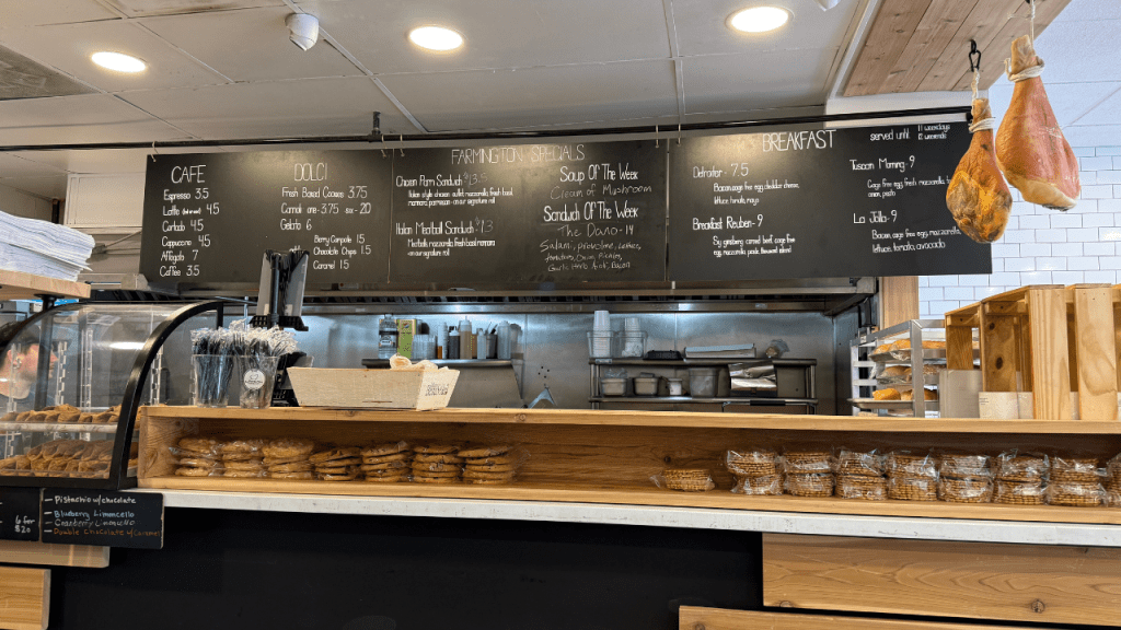 I headed out for my lunch break shortly after, figuring my order would be about ready either before or just as I arrived, since I was looking at about a 12-minute drive over to downtown Farmington. La Pecora Nera is essentially located right at the heart and center of downtown at the southwest corner of Farmington Road and Grand River Avenue. I snapped a couple of quick photos of the storefront and interior to showcase some of the other beverages, snacks, and unique items for sale before approaching the counter to pick up my order.