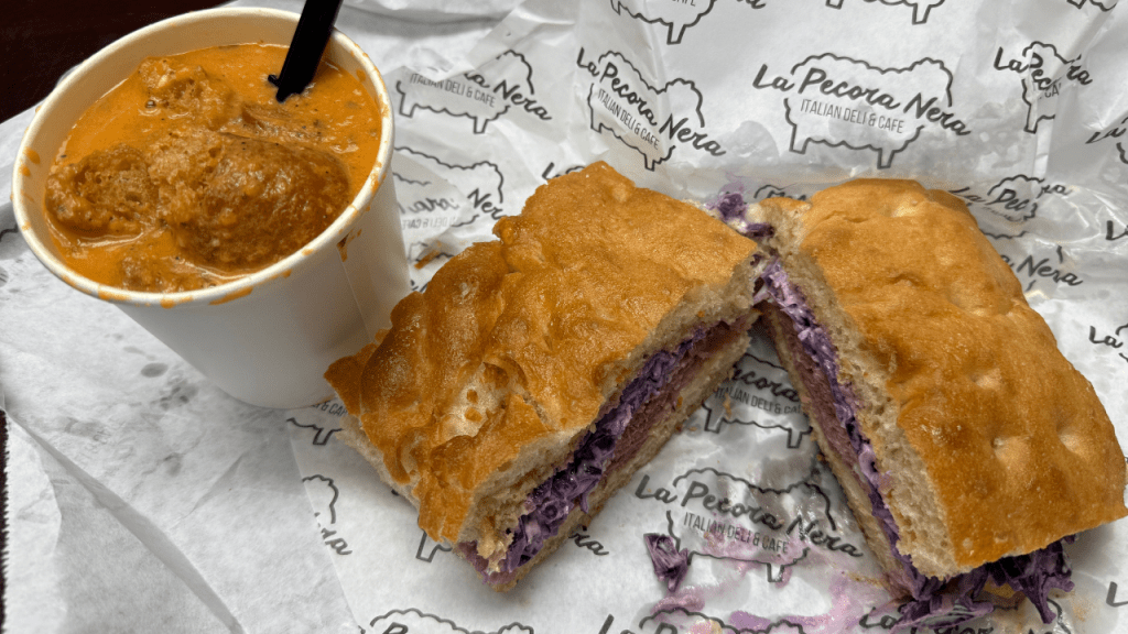 For starters, I was thrilled that the eatery was even open since it was the day after Christmas, but apparently, I wasn’t the only eager beaver since there were a few other patrons inside who were just finishing up eating at a table, and another gentleman walked in right after me to also pick up a to-go order. As I was closing out my payment, I chatted briefly with the employee who was working the register to learn a bit more about La Pecora Nera and what they’re all about. It turns out, the deli utilizes sourdough focaccia bread for its sandwiches from none other than Rising Stars Academy! I’ve covered the RSA several times, both for this food blog and my job. They’re an absolutely wonderful organization led by some of the kindest and most caring folks, with an inspiring mission and service that they provide for the community. So, naturally, La Pecora Nera immediately got brownie points before I even bit into a sandwich!
