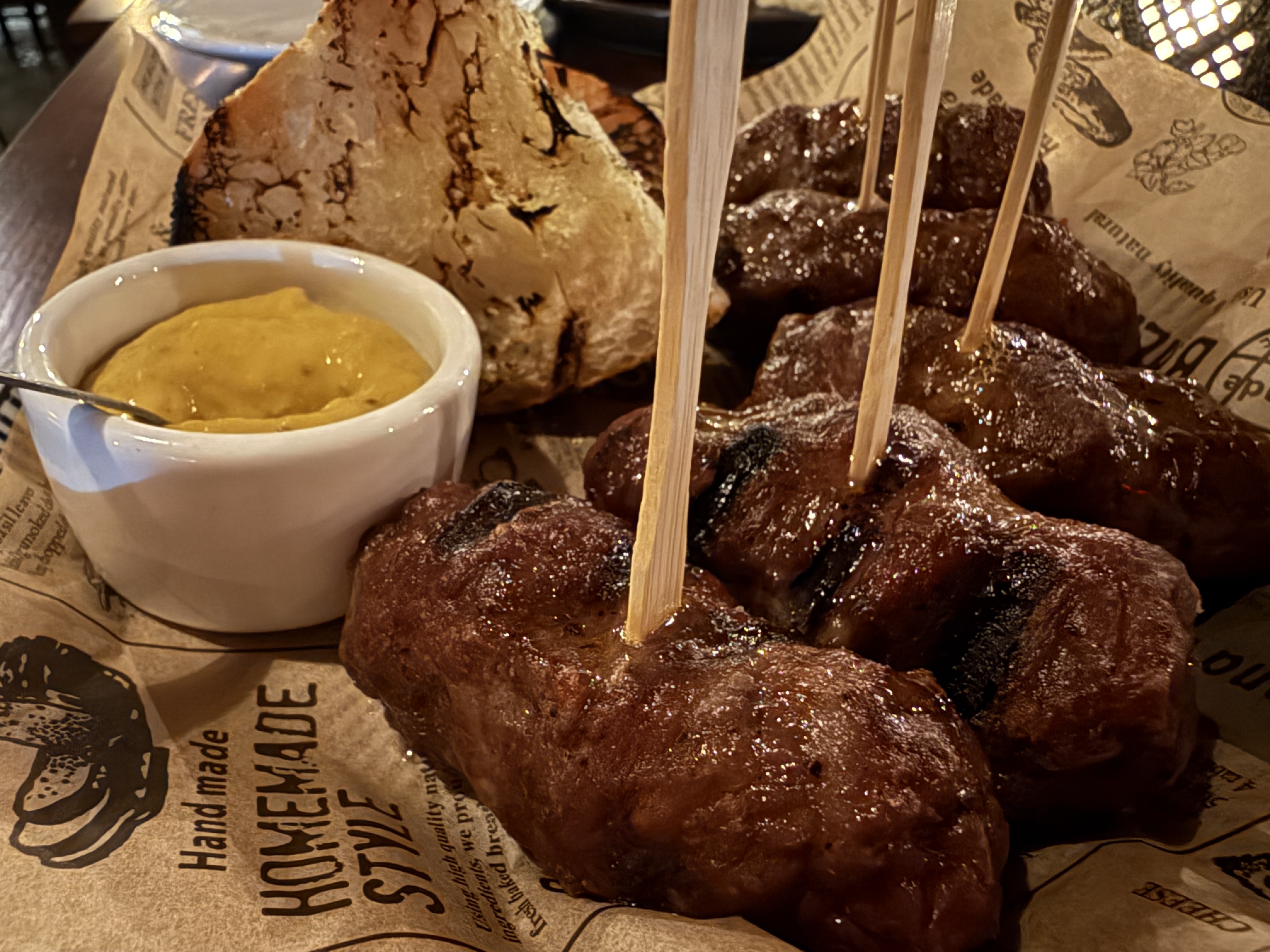 I did my best to limit myself to two pieces of bread, as I knew I had several more rounds of food ahead of me. Not long after finishing my second piece of focaccia bread, the Mititei had arrived. These iconic Romanian skinless sausages that get grilled are popular in small bite circles and BBQs, often served with mustard and toasted bread.