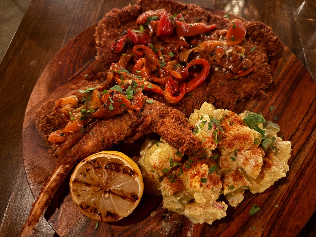 The next dish up was an entrée course, the Tomahawk Schnitzel. Aside from its obvious eye-catching and colorful appeal, I can attest that this dish is remarkable and worth experiencing if you’re in the mood for mixing it up. This surprisingly massive bone-in pork chop is entirely breaded and fried (or, schnitzel’ed) until golden and crispy, garnished with a red pepper dressing. Served alongside is a hearty potato salad topped with smoked paprika and a charred lemon.