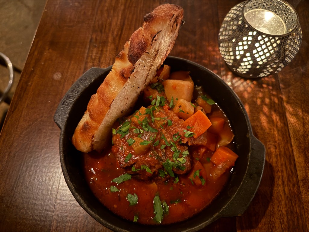 Chef Gabriel came by to check on me right as this dish came out, so we chatted for a couple of minutes before I actually dove into this dish. Which worked out since it gave my stomach some time to “catch up” to all that had been eaten prior, and I got to learn more about Gabriel’s approach to this Romanian rendition of goulash. I learned from Gabriel that some of the key differences between Romanian and Hungarian goulash are that Hungarian is typically served in a paprika-heavy soup base, with small dumplings (similar to what my friends and I experienced in Prague, minus the paprika). Romanian goulash usually leans closer to a stew and includes vegetables along with the potatoes.