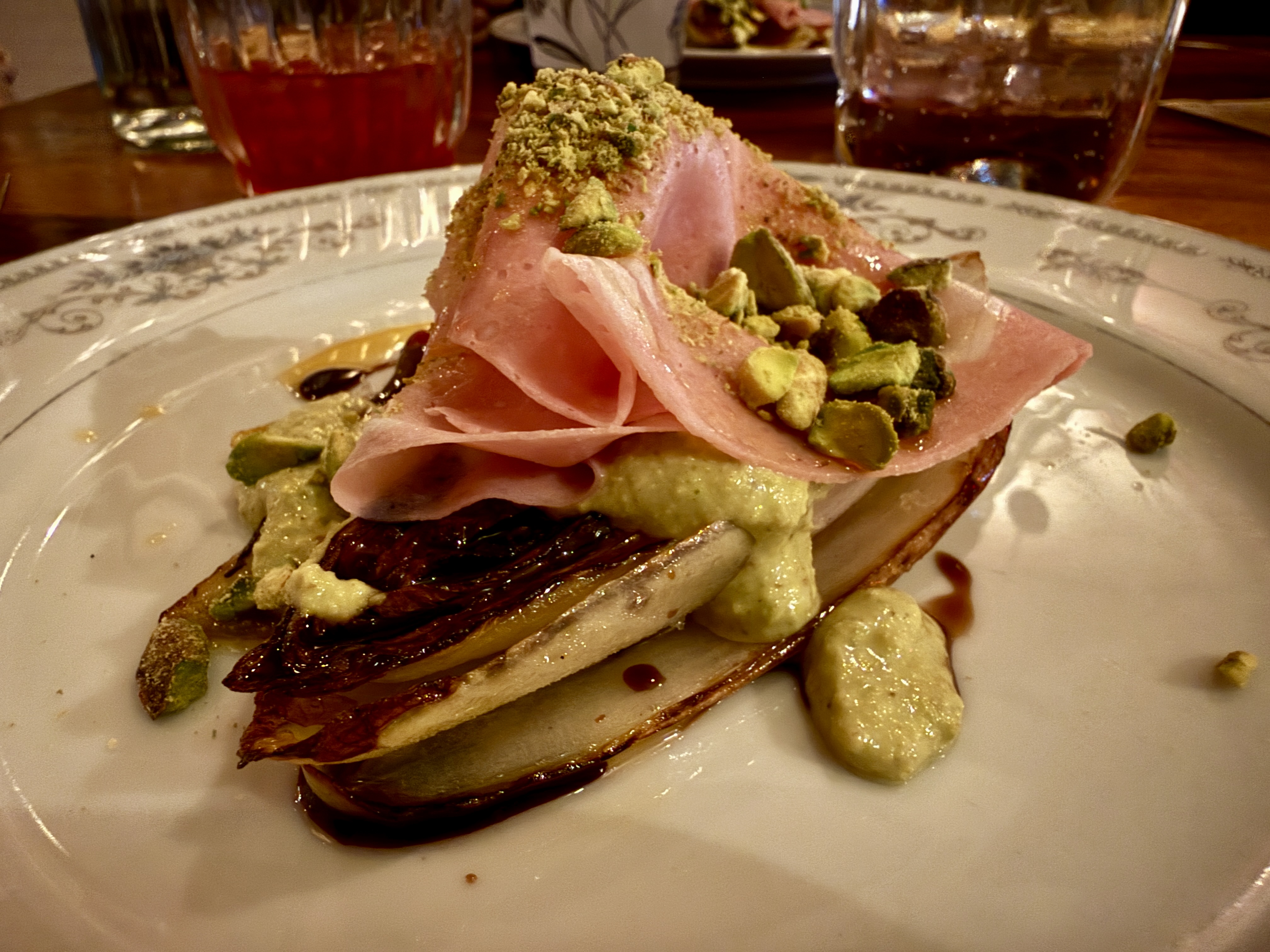 The following dish was the Griddled Endive, with a pistachio garnish. The rest of this bright dish included a thick cut of endive seared on the grill, pistachio crema, aged Balsamic, slices of mortadella, and Calabrian chiles. Jess also got an order of this, but without the mortadella, which is a large Italian sausage of finely ground and cured pork. The flavors were simpler for this dish, but had a powerful range from the salty cured pork to the tissue-paper soft-seared vegetable. The pungent pistachio was abundant, adding its renowned and unique nuttiness to the profile. I really enjoyed the two different texturized ways it was presented, as well as the care and craft taken into constructing this artisan dish.