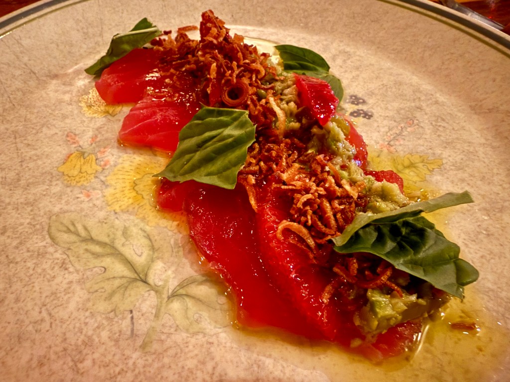 The Tuna Crudo was another ocular marvel of perfectly sliced and layered fresh tuna and blood orange. The two were doused with oil, then topped with a Castelvetrano tapenade, fried shallots, and basil. The tuna was exceptional and very flavorful, accentuated by the citrusy blood oranges, which shared a very similar consistency to the thin tuna slices.