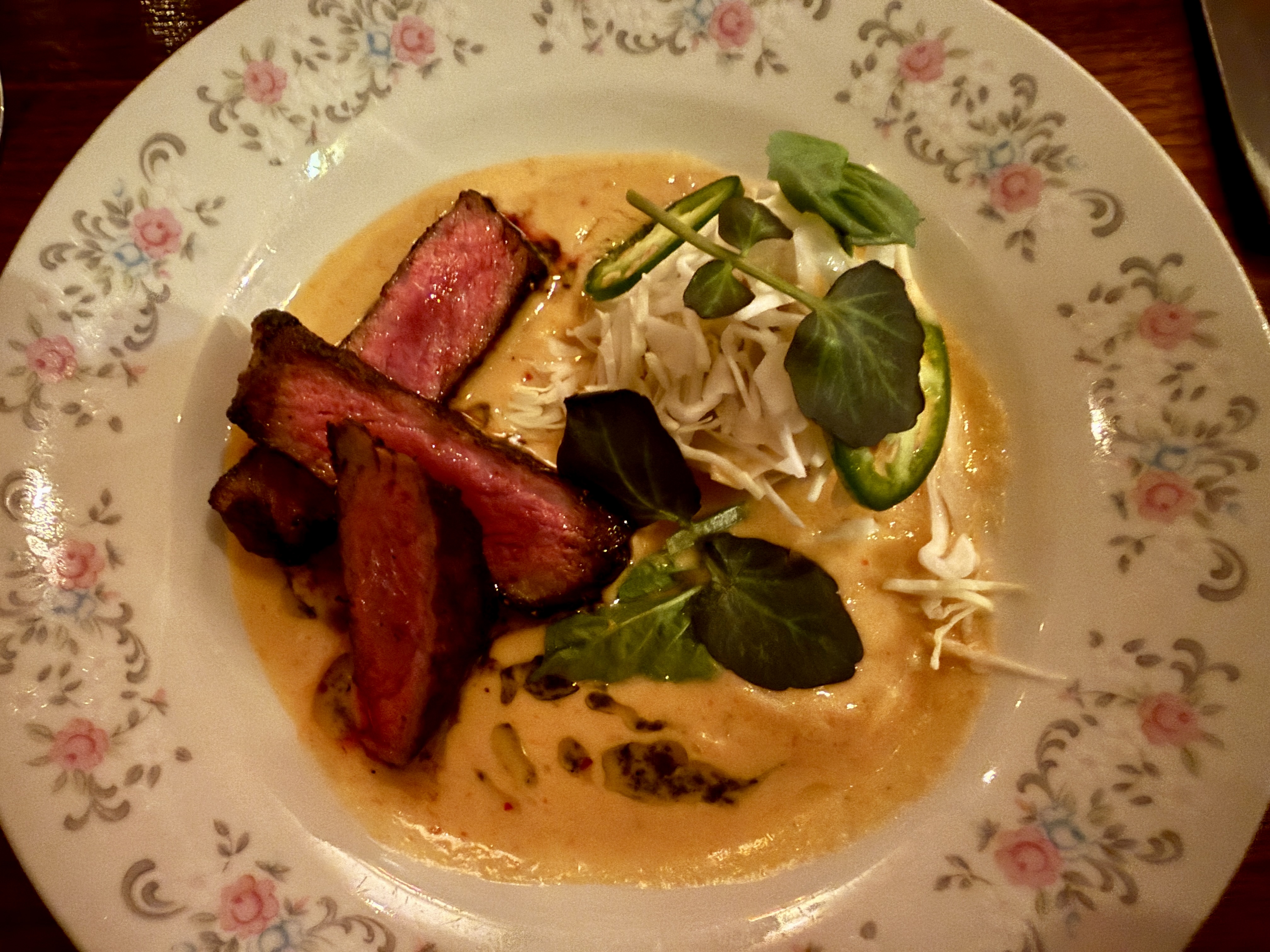 This steak was top-tier, grilled a perfect medium rare to rare, what some call rare-plus. The steak had absorbed a fair bit of the spicy red curry from the broth, which was another great flavor feature of this dish. I inhaled two slices of steak with small pools of the zesty broth before moving on to the dumpling itself. I bit in and tore away about half of the dumpling, which was just exploding in savory goodness. This dumpling was one of the best that I’ve ever had, which by this point in the meal, was becoming quite the reoccurrence. This dish is quite the spicy star!