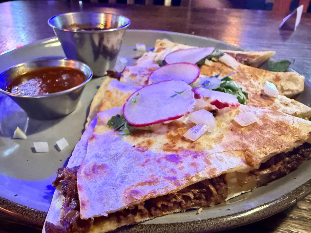 I learned from Keith and some of the servers that the Pork Green Chile was a popular menu item and was favored by many of the staff, as it’s a family recipe passed down through generations of the Head Chef. Since green (Hatch) chile dishes are rare in Michigan, and this one had such a personal touch, I decided to order the Pork Green Chile as my starter to get the foodie adventure off to a rocking start. I also decided to order the Quesadilla Birria to continue the southwest/Mexican theme, but I changed it up for the entrée and went with Andre’s Nashville Hot Chicken sandwich.